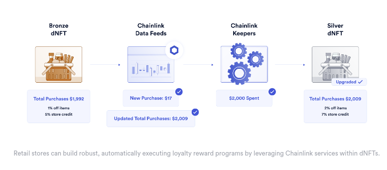 체인링크 자동화는 진정한 자율적이고 탈중앙화된 NFT 프로세스를 구축할 수 있는 쉬운 경로를 제공하며, 사용자 소유의 dNFT가 세부적으로 정확하게 작동할 수 있도록 지원합니다. 체인링크 데이터 피드 및 모든 API와 결합된 체인링크 자동화는 자동화되고 매력적인 쇼핑 보상 dNFT 프로그램, dNFT를 통한 친환경적인 행동 추적 등을 개발할 수 있도록 지원합니다.