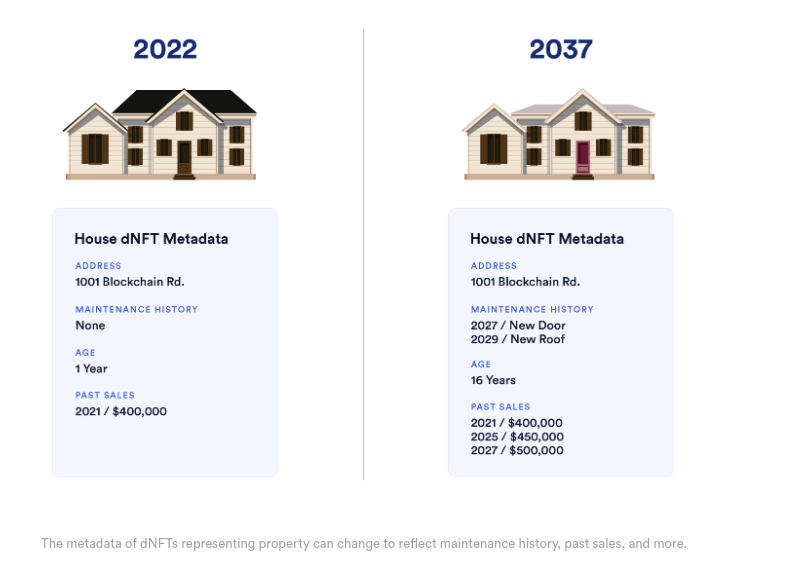 메타데이터 변경이 유용한 또 다른 사례는 실제 자산을 토큰화할 때인데, 이때는 여러 가지 메트릭을 변경해야 하는 경우가 많습니다. 예를 들어, 부동산을 나타내는 NFT는 유지보수 이력, 나이, 시장 가치 등을 반영할 수 있습니다. 따라서 이러한 변화하는 자산을 토큰화하려면 변화하는 메타데이터로 업데이트할 수 있는 NFT가 필요합니다.