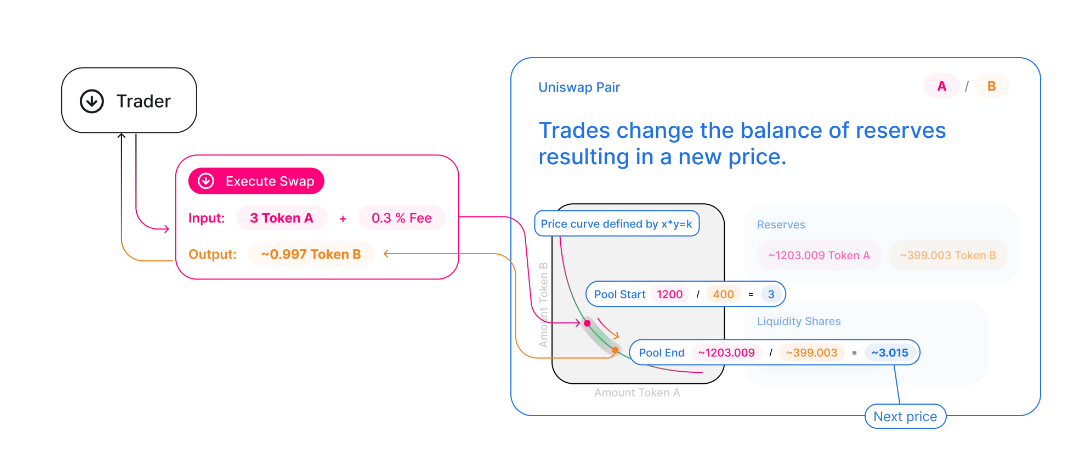 거래자들은 고정된 0.30%의 수수료(유동성 제공자에게 제공)로 이 토큰들을 서로 교환할 수 있다. 개발자는 Uniswap 스마트 계약과 직접 통합하여 토큰, 거래 인터페이스, 매매 경험 등을 통해 새롭고 흥미로운 상호 작용을 강화할 수 있습니다.